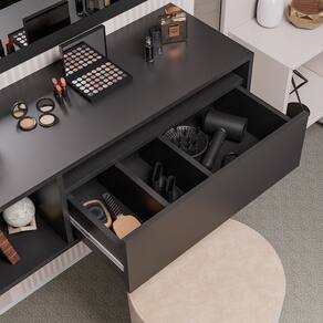 A Penteadeira Camarim Suspensa Mayumi é a escolha perfeita para quem busca funcionalidade e elegância. Ideal para otimizar qualquer espaço, este móvel contém uma largura de 90 cm, oferecendo um espaço amplo para suas necessidades de beleza. Produzida em MDP de alta qualidade, garante durabilidade e resistência. O revestimento em Melamina BP proporciona uma superfície lisa, fácil de limpar. O design suspenso confere um toque contemporâneo ao ambiente, ideal para quem busca uma decoração minimalista e funcional. Acompanha uma espelheira ampla, perfeita para suas rotinas de maquiagem e cuidados pessoais, garantindo praticidade e estilo. Conta com 1 Gaveta com Divisória e 1 nicho na lateral, oferecendo espaço suficiente para organizar seus itens essenciais. Possui uma estrutura robusta que suporta até 20 kg distribuídos, permitindo que você organize seus itens de maneira segura e prática. A montagem suspensa otimiza o espaço disponível, sendo ideal para ambientes menores já o tom Preto e o design minimalista permitem que esta penteadeira se integre facilmente a qualquer estilo de decoração. No Quarto ela é ideal para rotinas de maquiagem e cuidados pessoais, no Closet ela é essencial para manter seus itens de beleza sempre à mão, no Banheiro é perfeita para manter seus cosméticos e acessórios organizados de maneira prática e estilosa. Gostou? Não perca a oportunidade de transformar seu ambiente e facilitar sua rotina diária. Aproveite!