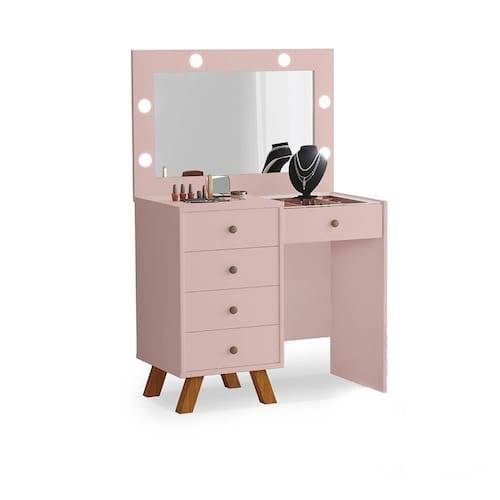 PESO DO PRODUTO (KG): 44 | COMPRIMENTO DO PRODUTO (CM): 45 | LARGURA PRODUTO COM EMBALAGEM (CM): 68.5 | CORES DO PRODUTO (FILTRO DE CORES): rosa | CONTEÚDO DA EMBALAGEM: 1 penteadeira | POSSUI GAVETAS: sim, 5 | POSSUI ILUMINAÇÃO: sim | PESO PRODUTO COM EMBALAGEM (KG): 44 | POSSUI BANQUETA: não | COR PREDOMINANTE: rosê | ALTURA DO PRODUTO (CM): 145 | ALTURA DO PRODUTO COM EMBALAGEM (CM): 28.8 | CUIDADOS: Limpar com pano macio e seco, não utilizar produtos abrasivos. | MATERIAL PRINCIPAL: mdf | LARGURA DO PRODUTO (CM): 93.5 | DESCRIÇÃO DO TAMANHO: 145 x 93.5 x 45 cm | MATERIAL PARA FILTRO: mdf | PRODUTO PRECISA DE MONTAGEM?: Sim, a montagem é simples mas sugerimos a contratação do nosso serviço de montagem (para os CEPs em que o serviço está disponível) ou de algum experiente de sua preferência | MARCA: luapa | PRODUTO: penteadeira | COMPRIMENTO PRODUTO COM EMBALAGEM (CM): 93 | ESTADO DE ORIGEM: sp