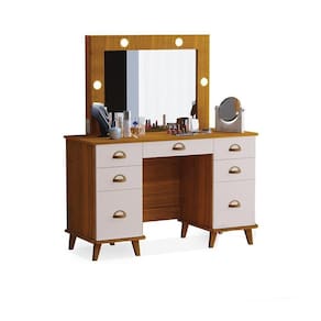 Essa Penteadeira conta com um design clássico, mas ainda assim moderno, somando na decoração de seu quarto ou closet, com bastante espaço para organização pessoal. Conta com um espelho com quadro iluminado por LED, gavetas laterais e uma gaveta central.