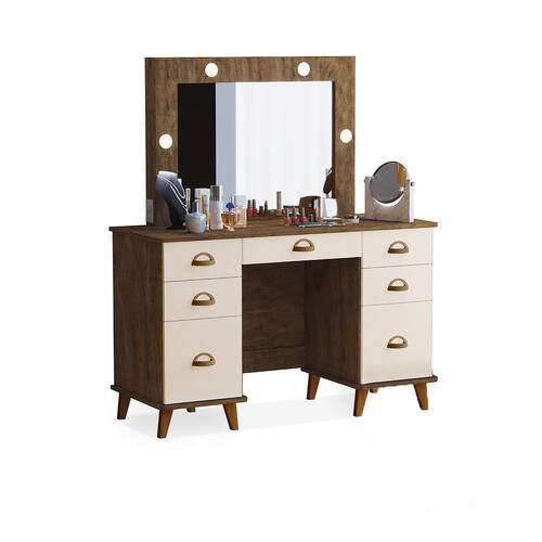 Essa Penteadeira conta com um design clássico, mas ainda assim moderno, somando na decoração de seu quarto ou closet, com bastante espaço para organização pessoal. Conta com um espelho com quadro iluminado por LED, gavetas laterais e uma gaveta central.