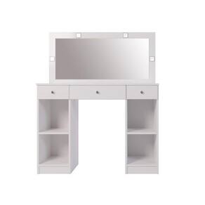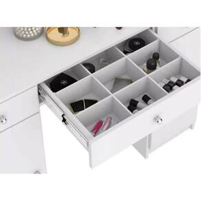 A Penteadeira é considerado um modelo clássico, e que deixa o quarto ainda mais elegante. Fabricada em MDP, possui 3 gavetas com corrediças telescópicas, sendo 1 gaveta com repartição, 2 portas com dobradiças metálicas com amplo espaço interno, espelho iluminado por quatro leds. Móvel que foi fabricado para facilitar na organização de perfumes, bijuterias, produtos de beleza, maquiagens e similares.
