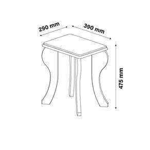 Elaborado em MDF, a penteadeira suporta até 30 kg e a banqueta 70 kg.