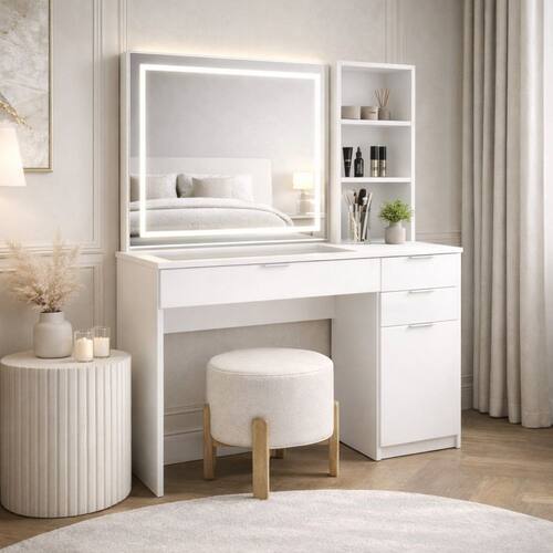 A Penteadeira com LED Bella Politorno é a escolha perfeita para quem busca praticidade, elegância e uma experiência completa de autocuidado no dia a dia. Com tampo de vidro sofisticado, LED embutido no espelho que garante iluminação ideal para maquiagem e cuidados com a pele, ela oferece uma gaveta com organizador de joias que mantém tudo visível e protegido, além de corrediças telescópicas que proporcionam abertura suave e silenciosa. Os nichos são ideais para organizar perfumes e produtos de skin care, deixando tudo sempre à mão, enquanto o acabamento em pintura UV confere maior durabilidade, brilho uniforme e fácil limpeza. Funcional, moderna e elegante, ela transforma sua rotina em um verdadeiro momento de bem-estar. Acabamento da Gaveta: Pintura UV Acabamento da Porta: Pintura UV Acompanha Banqueta: Não Acompanha Lâmpada: 01 Altura do Espelho: 67 cm Ambiente Principal: Quarto codigo_ean: 7900288310330 Complexidade da Montagem: Média: pode ser montado por mais de uma pessoa e/ou necessite de maior conhecimento para montagem Cor: Branco Cor do Produto: Branco Cor Interna: Branco Escala de Brilho: Semi-Fosco Escala de Brilho da Gaveta: Semi-Fosco Escala de Brilho da Porta: Semi-Fosco Espessura do Espelho: 3 mm Espessura do Vidro: 3 mm Formato do Espelho: Retangular Gaveta com Chave: Não Itens Inclusos: 1 Penteadeira, Kit Ferragens, Manual de Montagem e Termo de Garantia Largura do Espelho: 90 cm Linha ou Coleção: Bella Manual de Especificação Técnica: https://product-hub-prd.madeiramadeira.com.br/830714122/documents/f3a2a8ba-2f34-4fdb-a380-0bb2b6d453203356861622417684823609526.pdf Manual de Montagem e Instalação: https://product-hub-prd.madeiramadeira.com.br/830714122/documents/a9768391-3cf9-4448-93b6-0877bed2cdc53356860622417684823584079.pdf Marca: Politorno Material da Gaveta: MDP Material da Porta: MDP Material do Puxador da Gaveta: Metal Material Principal: MDP Necessita Montagem: Sim Origem do Produto: Nacional Peso: 38,68 kg Peso Máximo por Gaveta: 5 kg Possui iluminação: Sim Possui Pés: Não Possui Porta Objetos: Sim Possui Portas: 01 Possui Prateleiras: Não Possui Vidro: Sim Quantidade de Espelho: 01 Recomendações de Uso, Manutenção e Limpeza: Utilize um pano macio umedecido com água e sabão neutro, seguido de pano seco. Não utilize produtos químicos ou abrasivos para limpeza, pois estes danificam o revestimento do móvel. Sapatas Niveladoras: Sim Sistema de Montagem: Cavilha, Parafuso, Minifix e prego. Suporta Até (kg): 30 kg Tipo de Corrediça da Gaveta: Metálica Telescópica Tipo de Dobradiça/Corrediça da Porta: Metálica Tipo de Fixação do Espelho: Parafusos Tipo de Lâmpada: LED Tipo de Porta: Bater Tipo de Puxador da Gaveta: Externo Tipo de Puxador da Porta: Externo Marca: Não Informado