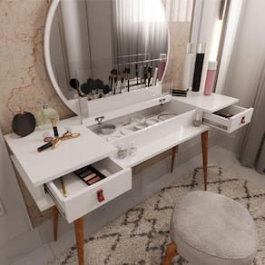 Material: MDP 15 mm e MDF 12 mm, espelho 3 mm e tampo de vidro de 5 mm e pés em Madeira Maciça;