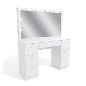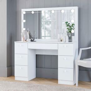 Sinta-se como uma estrela de cinema! A espetacular Penteadeira com Iluminação Camarim Ditália traz um estilo limpo e moderno para o seu quarto. Fabricada em madeira MDP UV com bordas melamínicas brancas, a penteadeira possui 7 gavetas onde você pode guardar tudo o que precisa para o seu dia a dia. De joias a documentos, seu ambiente ficará muito mais organizado e lindo. A base superior da mesa é ideal para guardar lembranças e recordações, trabalhar no seu notebook e divertir-se muito no espelho. Sinta-se em um camarim!