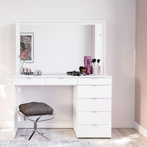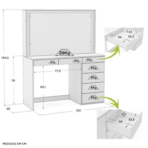 Com suas sete gavetas espaçosas, esta penteadeira oferece o local ideal para organizar todos os itens essenciais do seu dia a dia, desde joias preciosas até documentos importantes. Isso lhe permite manter seu ambiente sempre arrumado e elegante.