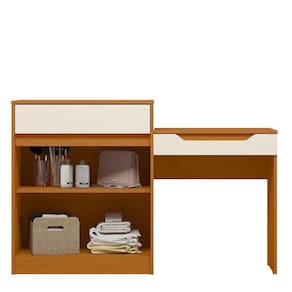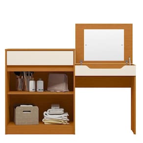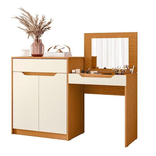 Penteadeira Escrivaninha Com Espelho 2 Portas 1 Gaveta Theo Cinamomo/off White Se você precisa de uma penteadeira de qualidade com amplo espaço de armazenamento então a Penteadeira Theo é o produto certo para você! Ela possui 2 portas de bater e 1 gaveta com corrediça telescópica, nicho com divisória para porta joias e tampo com pistão a gás em cima que possui um espelho! Com um produto incrível assim, seus momentos de beleza vão ser ainda mais prazerosos! Aproveite esse e outros produtos de qualidade na Casa Chick! Dimensões da Penteadeira Escrivaninha Theo: - Altura com Tampo Aberto:120 cm - Altura com Tampo Fechado: 91 cm - Largura: 139 cm - Profundidade: 45 cm