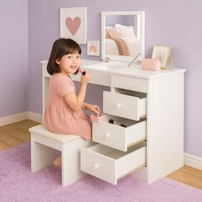 Transforme o quarto da sua pequena em um espaço encantador e funcional com esta penteadeira que vira escrivaninha, projetada para unir beleza, praticidade e diversão. Com design moderno e acabamento impecável, ela é perfeita para acompanhar as primeiras descobertas de vaidade e criatividade das crianças.