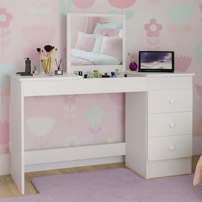 Destaques do Produto - Móvel 2 em 1: penteadeira e escrivaninha no mesmo produto. - Design moderno e versátil: pode ser usada como escrivaninha para estudos/trabalho ou como penteadeira para maquiagem. - Espelho incluso: ideal para sua rotina de beleza. - 3 gavetas espaçosas: organize maquiagens, documentos, acessórios e muito mais. - Tampo amplo: acomoda notebook, cosméticos e objetos decorativos.