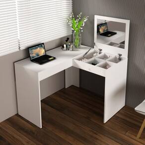 Descubra a combinação perfeita entre funcionalidade e elegância com a nossa Penteadeira/Escrivaninha de Canto 110cm com Espelho Multimóveis CR25280, que transformará seu ambiente no cantinho da beleza dos sonhos. Com formato em L e produzida em MDP de 15mm, ela oferece resistência e durabilidade excepcionais. A opção na cor branca possui acabamento em pintura UV, enquanto a cor preta possui um toque refinado em BP. Possui 1 porta basculante equipada com pistão e espelho de vidro (3mm), para acomodar joias, acessórios e maquiagens de forma organizada e prática. Além disso, o tampo suporta até 15kg, ideal para apoiar notebook e outros objetos.