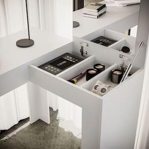 Com 1 porta basculante, 3 nichos organizadores e espaço para eletrônicos e decoração, você terá tudo à mão: maquiagens, acessórios, joias e muito mais!