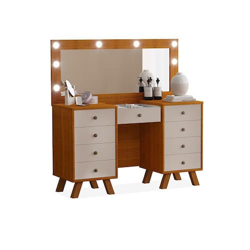 Essa Penteadeira conta com um design elegante e clássico, somando na decoração de seu quarto ou closet, com bastante espaço para organização pessoal. Conta com um largo espelho, gavetas laterais e uma gaveta central.