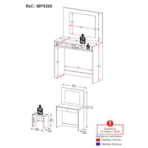 Dimensões do Produto Montado: Penteadeira - Altura: 137,5cm | Largura: 90cm | Profundidade: 40cm Banqueta - Altura: 45cm | Largura: 48cm | Profundidade: 30cm *Você pode consultar as medidas detalhadas na imagem técnica do produto.