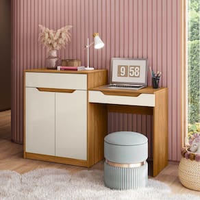 A Penteadeira Escrivaninha Bambolê é um móvel versátil, que proporciona ao seu usuário a melhor organização do ambiente e pode facilitar a sua rotina. Ao abrir o seu tampo basculante com pistão a gás, divisórias internas e espelho, ele se torna uma linda penteadeira, enquanto fechado uma excelente escrivaninha, possui ainda um armário lateral com gaveta e prateleira, e o melhor de tudo é adequado a ergonomia. Acabamento da Porta: Pintura UV Acabamento da Prateleira: Pintura UV Acompanha Banqueta: Não Altura do Espelho: 36 Ambiente Principal: Quarto Infantil Complexidade da Montagem: Alta: deve ser montado por um montador especializado Cor: Carvalho Grife/Off White Cor do Produto: Carvalho Grife/Off White Cor Interna: Carvalho Grife Escala de Brilho: Semi-Brilho Escala de Brilho da Porta: Semi-Brilho Escala de Brilho da Prateleira: Fosco Espessura do Espelho: 3 Formato do Espelho: Retangular Itens Inclusos: 1 Penteadeira, Kit Ferragens e Manual de Montagem Largura do Espelho: 45 Linha ou Coleção: Albatroz Manual de Especificação Técnica: https://cdn2.madeiramadeira.com.br/atributo/albatroz-moveis/1556634-esquema-181-penteadeira-escrivaninha-bambolE.pdf Manual de Montagem e Instalação: https://cdn2.madeiramadeira.com.br/atributo/albatroz-moveis/1556847-esquema-181-penteadeira-escrivaninha-bambolE.pdf Material da Porta: MDP Material da Prateleira: MDP Material dos Pés: MDP Material Principal: MDP Necessita Montagem: Sim Origem do Produto: Nacional Peso: 41.6 Peso Máximo por Prateleira: 5 Possui iluminação: Não Possui Moldura: Não Possui Pés: Rodapé Possui Porta Objetos: Sim Possui Portas: 02 Possui Prateleiras: 01 Possui Rodízio: Não Possui Vidro: Não Quantidade de Espelho: 01 Recomendações de Uso, Manutenção e Limpeza: Limpar com flanela ou pano macio seco, não utilizar produtos abrasivos, desengordurantes, álcool ou solvente. Não expor o produto diretamente á luz solar e á umidade. Sapatas Niveladoras: Não Sistema de Montagem: Parafusos, cavilhas e minifix Suporta Até (kg): 33 Tampo Basculante: Sim Tipo de Dobradiça/Corrediça da Porta: Metálica Tipo de Fixação do Espelho: Parafusos Tipo de Porta: Bater Tipo de Puxador da Porta: Embutido Ean: 7909903441497
