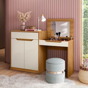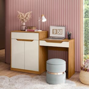 Penteadeira Infantil Camarim Bambolê Carvalho Grife/Off White. A Penteadeira Escrivaninha Bambolê é um móvel versátil, que proporciona ao seu usuário a melhor organização do ambiente e pode facilitar a sua rotina. Ao abrir o seu tampo basculante com pistão a gás, divisórias internas e espelho, ele se torna uma linda penteadeira, enquanto fechado uma excelente escrivaninha, possui ainda um armário lateral com gaveta e prateleira, e o melhor de tudo é adequado a ergonomia. Ean: 7909903441497