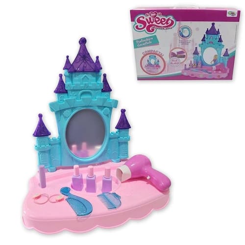 O que vem na embalagem?- 01 Penteadeira com espelho- 01 Mini secador de brinquedo (funciona com 1 pilha AA não inclusa)- 01 Mini pente- 01 Mini acessório de cabelo- 01 Batom de brinquedo- 02 Lacinhos de cabelo- 03 Esmaltes de brinquedo