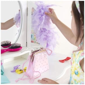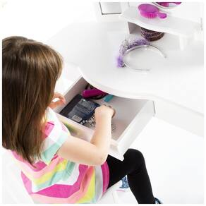 A Guidecraft Classic White Vanity and Stool Set é uma penteadeira infantil em madeira na cor branca, composta por mesa com tampo estreito, espelho triplo e banqueta coordenada, indicada para crianças a partir de 3 anos. A estrutura combina madeira maciça e madeira engenheirada com acabamento UV em branco fosco, formando um conjunto resistente para uso em quartos infantis e brinquedotecas.?
