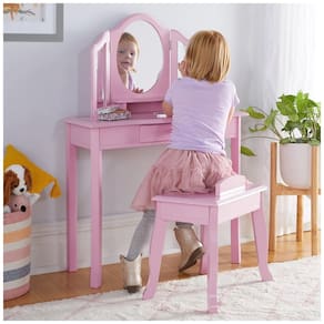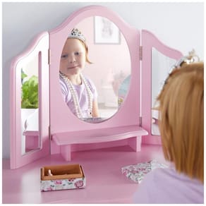 A penteadeira infantil Guidecraft Pink Vanity and Stool Set foi desenvolvida para compor um cantinho de vestir, maquiagem de faz de conta e organização de acessórios em quartos infantis. O conjunto inclui mesa com tampo retangular, gaveta central com puxador e espelho triplo em acrílico resistente a estilhaços, com moldura e laterais suavemente recortadas para compor o visual de penteadeira clássica em escala infantil.?