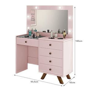 Penteadeira luna camarim com 4 gavetas e porta joias e maquiagem com tampo de vidro - roseA penteadeira luna é 100% mdf, sua pintura é uv anti risco, puxadores em metal com acabamento envelhecido, corrediças telescópicas, possui colmeia na gaveta central, bases laterais e tampo mdf 18mm, moldura do espelho mdf 15mm e 20mm, o espelho tem 3mm e o vidro do tampo 4mm. Possuindo 6 led de luz branca, pés em madeira de reflorestamento e 5 gavetas com a frente em mdf 15mm.CaracteristicasTipo: penteadeira camarimModelo: lunaCor: roseDimensões do produtoAltura: 145cmLargura: 93,5cmComprimento: 43cmObservaçãoNão acompanha banqueta (vendida separadamente)Imagens interna do produto corresponde ao modelo e não a corNecessita de montagem (fica por conta do cliente)Imagens meramente ilustrativasPenteadeira Luna Camarim com 4 Gavetas e Porta Joias e Maquiagem com Tampo de Vidro - Rose
