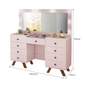 Penteadeira mila camarim com 8 gavetas e porta joias e maquiagem com tampo de vidro - roseA penteadeira mila é 100% mdf, sua pintura é uv anti risco, puxadores em metal com acabamento envelhecido, corrediças telescópicas, possui colmeia na gaveta central, bases laterais e tampo mdf 18mm, moldura do espelho mdf 15mm e 20mm, o espelho tem 3mm e o vidro do tampo 4mm. Possuindo 6 led de luz branca, pés em madeira de reflorestamento e 5 gavetas com a frente em mdf 15mm.CaracteristicasTipo: penteadeira camarimModelo: milaCor: roseDimensões do produtoAltura: 145cmLargura: 136,5cmComprimento: 43cmObservaçãoNão acompanha banqueta (vendida separadamente)Imagens interna do produto corresponde ao modelo e não a corNecessita de montagem (fica por conta do cliente)Imagens meramente ilustrativasPenteadeira Mila Camarim com 8 Gavetas e Porta Joias e Maquiagem com Tampo de Vidro - Rose