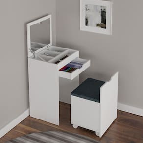 - Espessura da Estrutura: 15mm - Possui Gavetas?: Sim - Quantidade de Gavetas: 1 - Peso Suportado nas Gavetas (Kg): 3 Kg - Material das Corrediças: Metálica - Tipo da Corrediça: Convencional - Possui Portas?: Não - Possui Vidro?: Não - Possui Espelho?: Sim - Altura do Espelho: 54 Cm - Largura do Espelho: 45 Cm - Espessura do Espelho: 0,3 Cm - Possui Prateleiras?: Não - Possui Puxadores?: Sim - Material do Puxador: Abertura no Móvel - Possui Ripamento?: Não - Linha ou Coleção: Milena - Montagem Invertida?: Não Pode ser Montado Invertido - É frágil?: Não - Possui Nicho?: Não - Material da Estrutura: MDP - Escala de Brilho: Fosco - Material do Tampo: MDP - Espessura do Tampo (mm): 15 - Possui Rodízios?: Sim - Possui Sapatas?: Sim - Possui Pés?: Não - Quantidade de Pés/Sapatas: 4 - Possui espelho?: Sim - Acompanha: 1 Penteadeira, 1 Banqueta, Kit Ferragens e Manual de Montagem - Acompanha Manual de Montagem: Sim - Como os Móveis Chegarão na Minha Casa: Desmontados, em caixas, acompanhados de todas as peças, ferragens e manuais para montagem - Grau de Dificuldade da Montagem: Fácil - Necessita de Montagem: Sim - Sistema de Montagem: parafuso, cavilha, minifix - Garantia (dias): 90 - Indicação de Uso: Quarto - Observação: Objetos decorativos que aparecem nas imagens, não acompanham o produto. - Recomendação de Manutenção: Limpar com pano levemente umedecido - Revestimento /Acabamento: Pintura BP - Acompanha Bocais Para Lâmpadas: Não - Acompanha Espelho: Sim - Acompanha Fiação Elétrica: Não - Acompanha Lâmpadas: Não - Voltagem: Não Possui