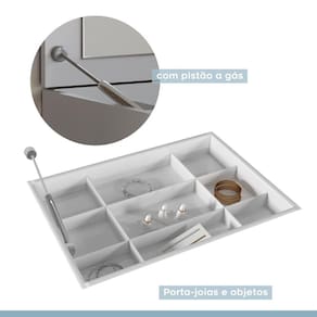 Exclusiva Penteadeira Multiuso com Espelho Tigus, podendo ser fechada apenas inclinando a parte superior, servindo como apoio para estudo, e uma possível cômoda para seu ambiente, além disso, oferece um amplo espaço interno com divisão interna para joias e maquiagem como seu grande diferencial, destacando-se de outras opções sendo eleita a penteadeira preferida do mercado. A penteadeira ideal para você, que merece ter todos esses benefícios em sua casa. Acabamento da Porta: Pintura UV Acabamento da Prateleira: Pintura UV Acompanha Banqueta: Não Altura do Espelho: 35 cm Ambiente Principal: Quarto Complexidade da Montagem: Média: pode ser montado por mais de uma pessoa e/ou necessite de maior conhecimento para montagem Cor: Branco Cor do Produto: Branco Escala de Brilho: Fosco Escala de Brilho da Porta: Fosco Escala de Brilho da Prateleira: Fosco Espessura do Espelho: 3 mm Formato do Espelho: Retangular Informações Complementares: Mesa multiuso para quem precisa estudar, ultilizar computador e também se produzir utilizando o tampo que, quanto aberto, possui um espelho e porta jóias/maquiagem. Itens Inclusos: 1 Penteadeira, Kit Ferragens e Manual de Montagem. Largura do Espelho: 50 cm Manual de Montagem e Instalação: https://cdn2.madeiramadeira.com.br/atributo/tigus-baby/941076-manual-penteadeira-multiuso-tigus-revisao-01.pdf Material da Porta: MDP Material da Prateleira: MDP Material do Puxador da Porta: MDF Material Principal: MDP Necessita Montagem: Sim Origem do Produto: Nacional Peso: 29,55 kg Peso Máximo por Prateleira: 5 kg Possui iluminação: Não Possui Moldura: Não Possui Pés: Não Possui Porta Objetos: Sim Possui Portas: 02 Possui Prateleiras: 01 Possui Vidro: Não Quantidade de Espelho: 01 Recomendações de Uso, Manutenção e Limpeza: Limpar com pano macio e levemente umedecido. Não utilizar solventes a base e de inflamáveis. Não utilizar produtos abrasivos. Sapatas Niveladoras: Não Sistema de Montagem: Parafusos, cantoneiras e cavilhas. Suporta Até (kg): 20 kg Tampo Basculante: Sim Tipo de Dobradiça/Corrediça da Porta: Metálica Tipo de Fixação do Espelho: Silicone Tipo de Porta: Misto (Bater e Basculante) Tipo de Puxador da Porta: Externo