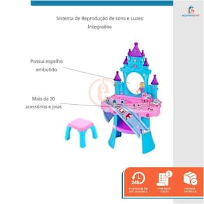 Penteadeira Musical Castelo Princesa Com Banquinho Baby Style A Penteadeira Musical com Banquinho Baby Style tem um lindo formato de castelo digno de uma princesa. Um camarim próprio com mais de 30 acessórios e jóias, e claro o mastro e uma coroa com detalhes apaixonantes para ficar ainda mais linda. Diferente de todas as penteadeiras, a penteadeira é divertida e educativa, conta com um lindo sistema de som e luz para dar um charme mais especial para a brincadeira. Tem um espelho perfeito para as princesas se admirarem. Suas cores são vibrantes e harmonizam entre si. Tudo pensado para o faz de conta estar à altura desta princesa, podendo montar e posicionar os adereços da forma que preferir. - Interação com a família;- Aprende brincando manualmente;- Desperta a adaptação social e interação;- Aprendizado pela repetição;- Expressão e comunicação;- Imaginação e criatividade;- Estimula a coordenação motora;- Incentiva e induz à autonomia da criança em montar e desmontar seu próprio brinquedo; - As peças podem ser guardadas no próprio compartimento. CARACTERÍSTICAS TÉCNICAS:Material: Plástico PPMedidas modo carrinho: 41cm altura x 36cm largura x 24cm comprimento Idade recomendada: A partir dos 3 anosProduto certificado pelo INMETRO 004181/2020Necessita de 3 pilhas AA Não incluso Peso: 1,1kgMarca: Baby StyleRef.: 668637