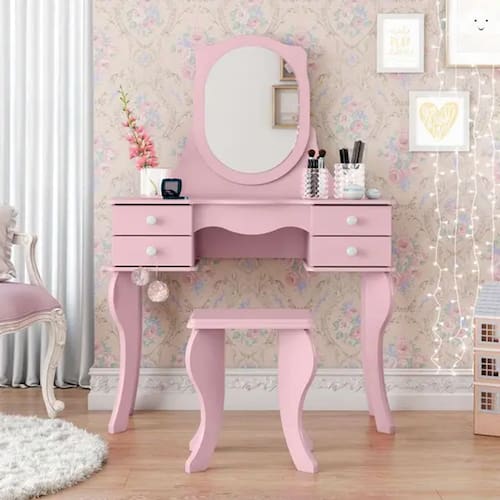 As penteadeiras geralmente roubam a cena e encantam. É hoje um dos móveis mais desejados para integrar a decoração com muito glamour. A penteadeira Princesa, vem com seu visual clássico contemporâneo tornando-a mais charmosa. Conta com 4 gavetas, espelho e banco que trás com ela a funcionalidade de poder guardar de forma organizada produtos que vão fazer sobre sair a beleza feminina.