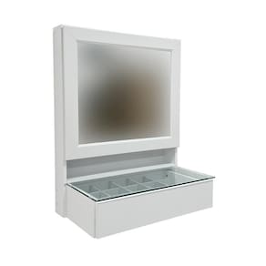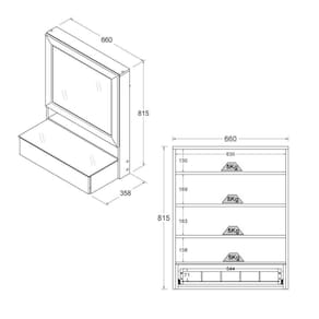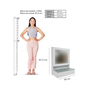 Possui uma gaveta com divisória e tampo de vidro, perfeita para organizar maquiagens, joias e acessórios, além de quatro prateleiras que oferecem espaço extra para os seus itens do dia a dia.