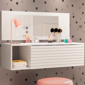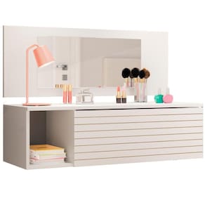 Penteadeira Joy Peternella, compacta, versátil e estilosa. Produzida em MDP/MDF de 15 mm, pintura UV, conta com 01 nicho, 01 gaveta com 03 repartições, painel com espelho. Penteadeira Joy Peternella, te possibilita armazenar os mais distintos objetos. Este móvel chegará em sua casa separado em 01 volume.