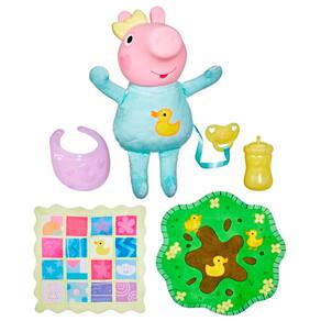 A irmãzinha da Peppa, Evie, chegou! As crianças vão adorar recriar suas cenas favoritas com sua própria boneca bebê Evie. Quando as crianças dão a mamadeira à Evie, ela emite sons adoráveis na hora da refeição. Ou dê a ela a chupeta para ouvir mais sons fofos. Mover a Evie para cima e para baixo para ouvir os efeitos sonoros de brincadeira, como risadas e "oincs". Imaginar-se pulando em poças de lama com o tapete de brincar. Na hora de fingir que estão dormindo, as crianças podem deitar a boneca bebê fofinha para ouvir uma canção de ninar e depois roncar!