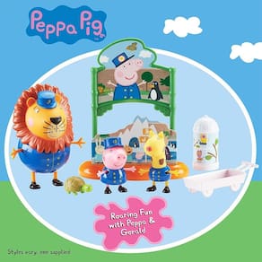 leve Peppa e Gerald para uma visita divertida para ver seus amigos do zoológico, incluindo o Sr. Lion, o tratador!