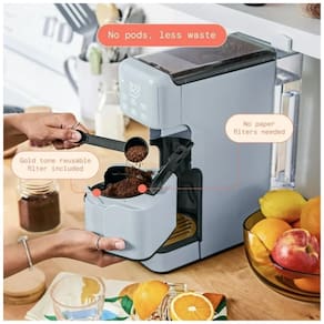 Tecnologias integradas englobam filtro ouro reutilizável, suporte para cápsulas K-cup, display touch programável com timer para preparo automático, função pausa e serve, manutenção térmica e bandeja de gotejamento ajustável até 17,8 cm de altura para canecas ou tumblers.
