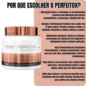 Para cabelos indisciplinados que precisam de transformação, Perfeitox é o tratamento completo, oferecendo hidratação profunda, brilho e controle de frizz como você nunca viu. Sua fórmula avançada combina 19 aminoácidos essenciais que atuam na reconstrução capilar, restaurando a saúde dos fios danificados e devolvendo sua força natural. Com um blend exclusivo de 12 óleos nobres, Perfeitox penetra profundamente na fibra capilar, nutrindo intensamente e revitalizando a estrutura dos fios, proporcionando disciplina e alinhamento duradouro.