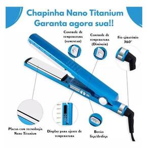 Performance inigualável: chapinha prancha nano titanium 1 1/4 Chapinha prancha para cabelo Chega de frizz com regulador de temperatura para até 450ºf 230ºc , esta chapinha é ideal para você ficar bela e impecável com lindos fios lisos e sem danificá-los. Feita em tecnologia de ponta, ela é ideal para todos os tipos e suas placas de titânio aquecem rapidamente alisando o cabelo de forma rápida e fácil. Além de tudo ela conta com um cabo giratório em 360º para facilitar seu uso