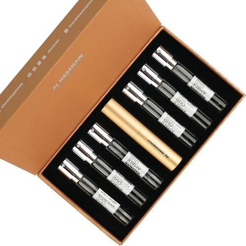 Coleção Al Haramain Discovery — Amber Oud para adultos unissex — Conjunto de minipresente de 6 peças Amber Oud de 0,33 onças, atomizador de perfume
