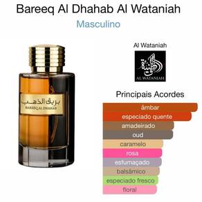 Bareeq Al Dhahab, faz parte da linha Dubai de Al Wataniah. Originário dos Emirados Árabes Unidos, Al Wataniah nasceu do desejo de entregar ao mundo elegantes fragrâncias com um toque místico, sedutor e de alta qualidade. Possui perfumes que combinam as melhores notas francesas com notas orientais, desenvolvidos por perfumistas de renome em todo o mundo. Suas combinações exclusivas são intensas e viciantes, cativando os que ousam se deixar seduzir por sua magia.