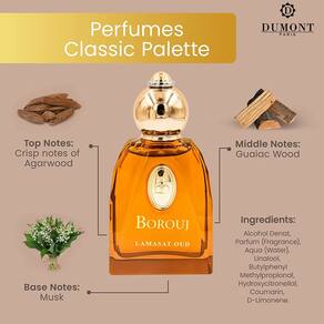 Produto 100% autêntico, selado — Dumont BOROUJ LAMASAT OUD — Tamanho de viagem de 85 ml — Perfume unissex de inspiração árabe para homens e mulheres — Fragrância almiscarada, amadeirada e oriental — Névoa de colônia e spray corporal de longa duração — Para ele e ela — Uma fragrância