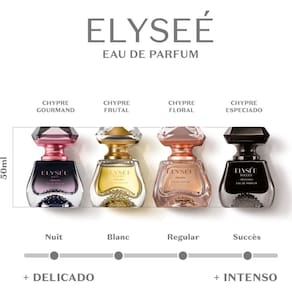 O Elysée Eau de Parfum possui uma embalagem extremamente sofisticada que remete a uma joia. A sua fragrância feminina contém matérias-primas de alta qualidade e riqueza como a Mandarina Orpur, que remete a extrema sofisticação da família olfativa Chypre.