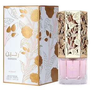 Spray de perfume Lattafa Asdaaf Raneen para mulheres, 3,4 onças/100 ml - Lattafa Asdaaf Raneen Eau de Parfum é uma fragrância cativante criada para mulheres que abraçam elegância e charme - Notas principais: fruta do dragão, pera, tangerina - Notas médias: jasmim, frésia, flor de laranjeira - Notas de base: almíscar, baunilha, fava tonka, Âmbar — Perfeito para qualquer ocasião