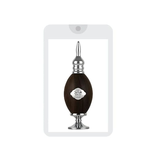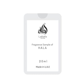 Tamanho experimental da Eau De Parfum Lattafa Hala, 20 ml/0,67 onças (unissex) — Hala da Lattafa Perfumes é resinosa-amadeirada para mulheres e homens — Notas principais: noz-moscada, pimenta — Notas médias: cedro, âmbar — Notas básicas: incenso, ládano — Adequada para uso diário — Aprovada pela companhia aérea — Aprovada pela TSA — Ótima maneira de experimentar antes de você comprar