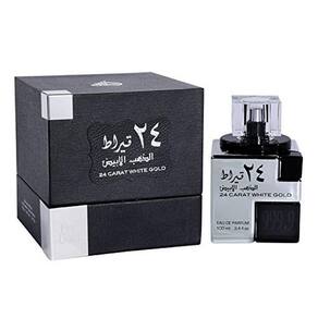 Lattafa Perfumes em ouro branco de 24 quilates para spray de água de perfume unissex, 3,4 onças - ouro branco de 24 quilates da Lattafa Perfumes é uma fragrância âmbar para mulheres e homens - NOTAS PRINCIPAIS: flor de laranjeira e bergamota - NOTAS MÉDIAS: noz-moscada, lavanda, pimenta rosa e gerânio - NOTAS DE BASE: madeira de ágar (oud), vetiver e tonka feijão