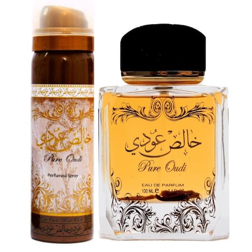 Conjunto de 2 peças Lattafa Perfumes Pure Oudi (Khalis Oudi) para unissex (3,4 onças de spray Eau de Parfum mais 1,7 onça de spray corporal perfumado) — O conjunto contém: - 3,4 onças de spray de água de perfume - 1,7 onças de spray corporal perfumado — Notas principais: canela, oudh e noz-moscada. - Notas médias: jasmim e sândalo. - Notas de base: almíscar, âmbar, cedro, madeira guaiac e baunilha.