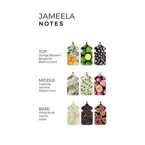 - Acordo de base cativante: entregue-se ao acabamento sedutor de Jameela, um perfume de longa duração para mulheres que harmoniza almíscar branco, baunilha e cedro, oferecendo uma impressão duradoura.