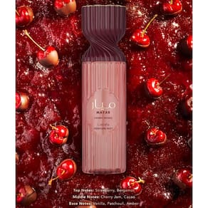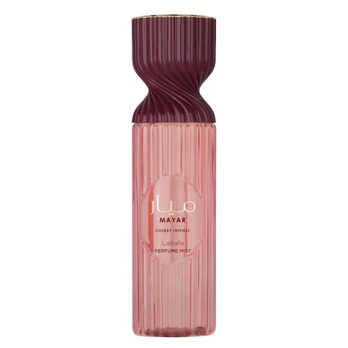 Lattafa Mayar Cherry Intense Perfume Mist 250 ml – Spray corporal Sweet Gourmand com notas de morango, bergamota, cereja, cacau, baunilha, patchouli e âmbar