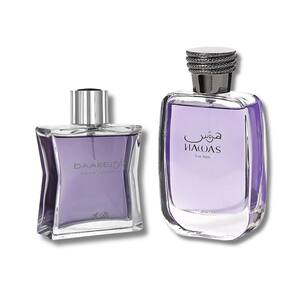 Hawas for Him combina canela, bergamota, flor de laranjeira, âmbar cinza e sândalo para criar um perfume aquático projetado para incorporar força e vigor masculinos. Notas principais: maçã, bergamota, limão e canela Notas médias: flor de laranjeira, cardamomo e ameixa Notas de base: patchouli, âmbar cinza, madeira suja e almíscar. Daarej para homens é uma mistura picante, sedutora e romântica que se abre com fortes notas de especiarias e serpenteia pelas notas médias florais, misturadas com um toque de romance com os destaques das rosas. Notas principais: cardamomo, artemísia e cominho Notas médias: rosa e orris Notas de base: sândalo, patchouli, âmbar, almíscar, baunilha e tonka - Hawas for Him combina canela, bergamota, flor de laranjeira, âmbar cinza e sândalo para criar um perfume aquático projetado para incorporar força e vigor masculinos. Notas principais: maçã, bergamota, limão e canela Notas médias: flor de laranjeira, cardamomo e ameixa Notas de base: patchouli, âmbar cinza, madeira suja e almíscar. - Daarej para homens é uma mistura picante, sedutora e romântica que se abre com fortes notas de especiarias e serpenteia pelas notas médias florais, misturadas com um toque de romance com os destaques das rosas. Notas principais: cardamomo, artemísia e cominho Notas médias: rosa e lírio Notas de base: sândalo, patchouli, âmbar, almíscar, baunilha e tonka