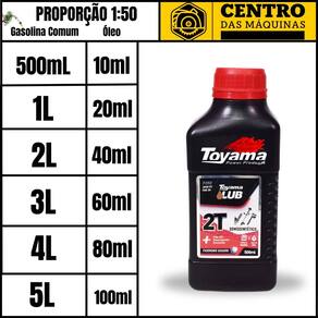 Operador, instrução de mistura recomendada para a utilização da máquina com o Óleo 2T TOYAMA LUB (1:50) 500ml : Observe sempre a proporção da mistura específica deste óleo, onde para cada 1 Litro de Gasolina utilizar 20ml do Óleo TOYAMA, ou para cada 500ml de Gasolina utilizar 10ml do Óleo TOYAMA. Além de manter o bom funcionamento, você pode prevenir futuras falhas e excesso de fumaça no cilindro de combustão.