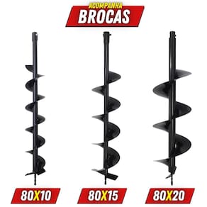- Broca 80x15cm Com Pino Trava e Grampo - Tipo: Broca para perfurador de solo - Diâmetro da Broca: 15cm - Comprimento da Broca: 80cm - Acoplamento: o tamanho do furo pra encaixe do eixo da broca é de 2cm.
