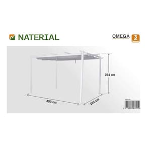 Características do Pergolado Aluminio Omega Cinza e Branco 2,54 x 4 m Naterial Ele conta com estrutura em aço e tem cores cinza e branco. Quanto às dimensões, este pergolado possui 2,5 m de altura, 4 m de largura e 4 m de comprimento. Seu toldo é retangular, de espessura grossa e tem medida de 2,85 x 4 metros.