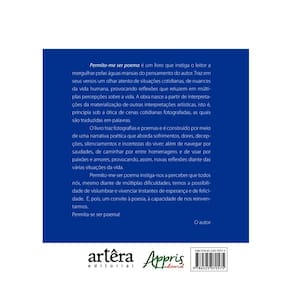 Permito-me ser poema é um livro que instiga o leitor a mergulhar pelas águas mansas do pensamento do autor. Traz em seus versos um olhar atento de situações cotidianas, de nuances da vida humana, provocando reflexões que reluzem em múltiplas percepções sobre a vida. A obra nasce a partir de interpretações da materialização de outras interpretações artísticas, isto é, principia sob a ótica de cenas cotidianas fotografadas, as quais são traduzidas em palavras. O livro traz fotografias e poemas e é construído por meio de uma narrativa poética que aborda sofrimentos, dores, decepções, silenciamentos e incertezas do viver; além de navegar por saudades, de caminhar por entre homenagens e de voar por paixões e amores, provocando, assim, novas reflexões diante das várias situações da vida. Permito-me ser poema instiga-nos a perceber que todos nós, mesmo diante de múltiplas dificuldades, temos a possibilidade de vislumbrar e vivenciar instantes de esperança e de felicidade. É, pois, um convite à poesia, à capacidade de nos reinventarmos. Permita-se ser poema! O autor